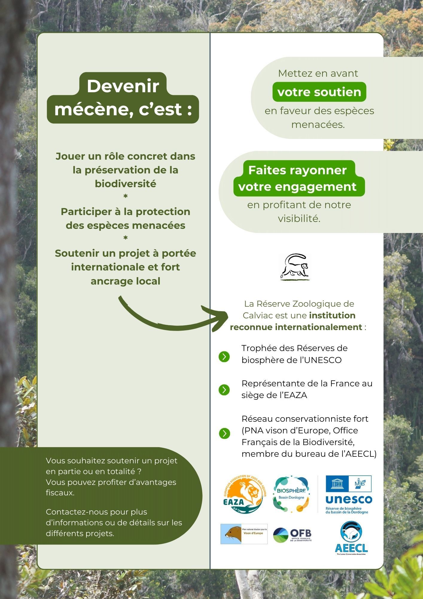 Si votre entreprise souhaite œuvrer avec nous pour la préservation de la biodiversité et la protection des espèces menacées, engagez-vous auprès de la Réserve comme mécène !